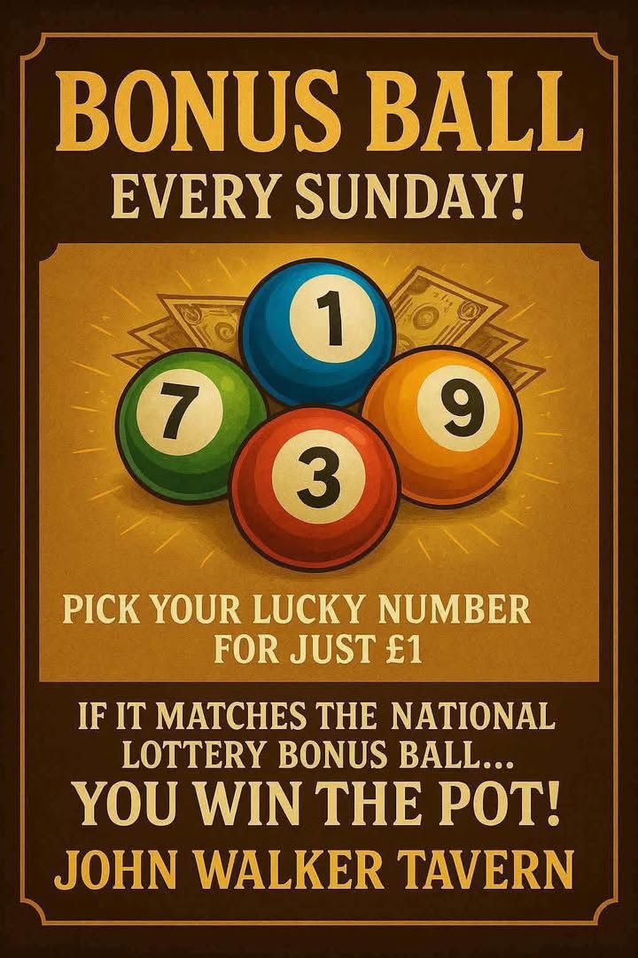 🎱 BONUS BALL – Every Week at John Walker Tavern! 🎱 Fancy your chances at a big win? 🍀 Pick your lucky number for just £1 – if it matches the National Lottery Bonus Ball, you WIN THE POT! 💰 Simple. Fun. Weekly. Ask at the bar to get your number today! 🍻 📍 John Walker Tavern – Stockton’s home for great pints, good company & lucky wins
