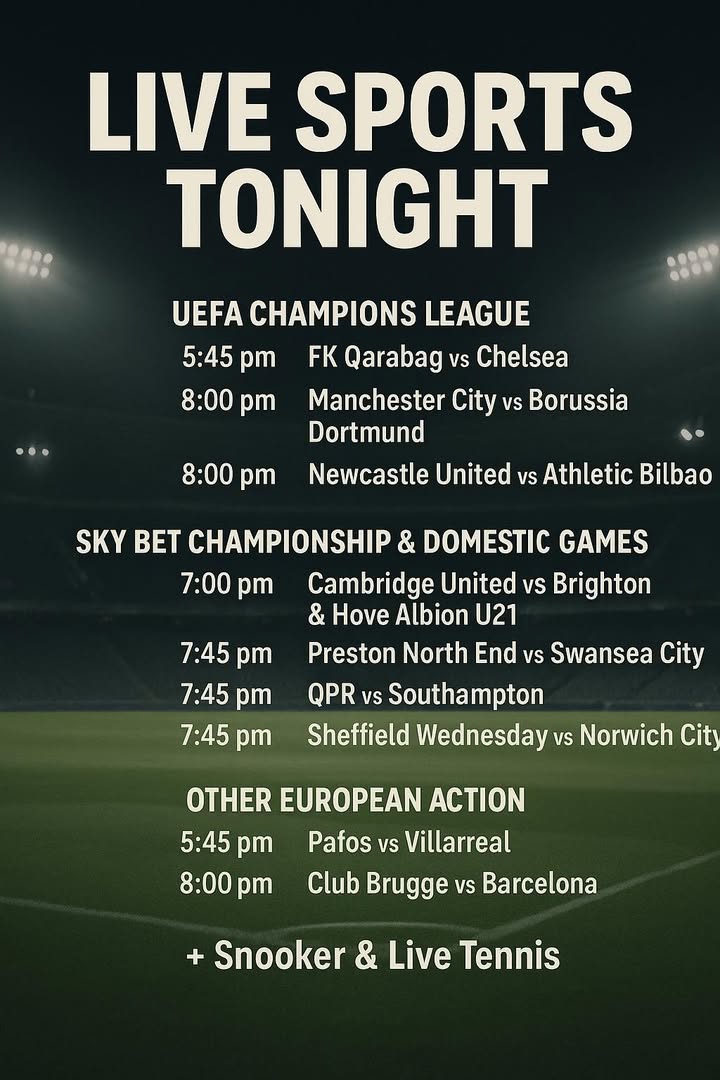 ⚽ Football Night is Here! ⚽ It’s a HUGE evening of European and domestic football — perfect for a mid-week pint and some top-class action! 🍻🔥 🏆 UEFA Champions League Highlights • FK Qarabag vs Chelsea – 5:45pm • Manchester City vs Borussia Dortmund – 8:00pm • Newcastle United vs Athletic Bilbao – 8:00pm 🇬🇧 Sky Bet Championship & Domestic Games • Cambridge United vs Brighton & Hove Albion U21 – 7:00pm • Preston North End vs Swansea City – 7:45pm • QPR vs Southampton – 7:45pm • Sheffield Wednesday vs Norwich City – 7:45pm 🇪🇺 Other European Action • Pafos vs Villarreal – 5:45pm • Club Brugge vs Barcelona – 8:00pm 🎱 Plus daytime Snooker & Live Tennis! ⸻ 📍 Catch every kick, tackle & goal LIVE with great atmosphere and cold drinks waiting! ⚽🍺 See you tonight for a big night of football!
