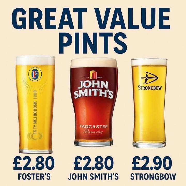 ⭐️GREAT VALUE PINTS⭐️ ✨ Foster’s just £2.80 ✨ John Smith’s Smooth only £2.80 ✨ Strongbow just £2.90 Come enjoy a relaxed pint with mates in a friendly atmosphere, great drinks, great value, always welcome! 🍻 📍 Pop in today we’re pouring quality at the right price.