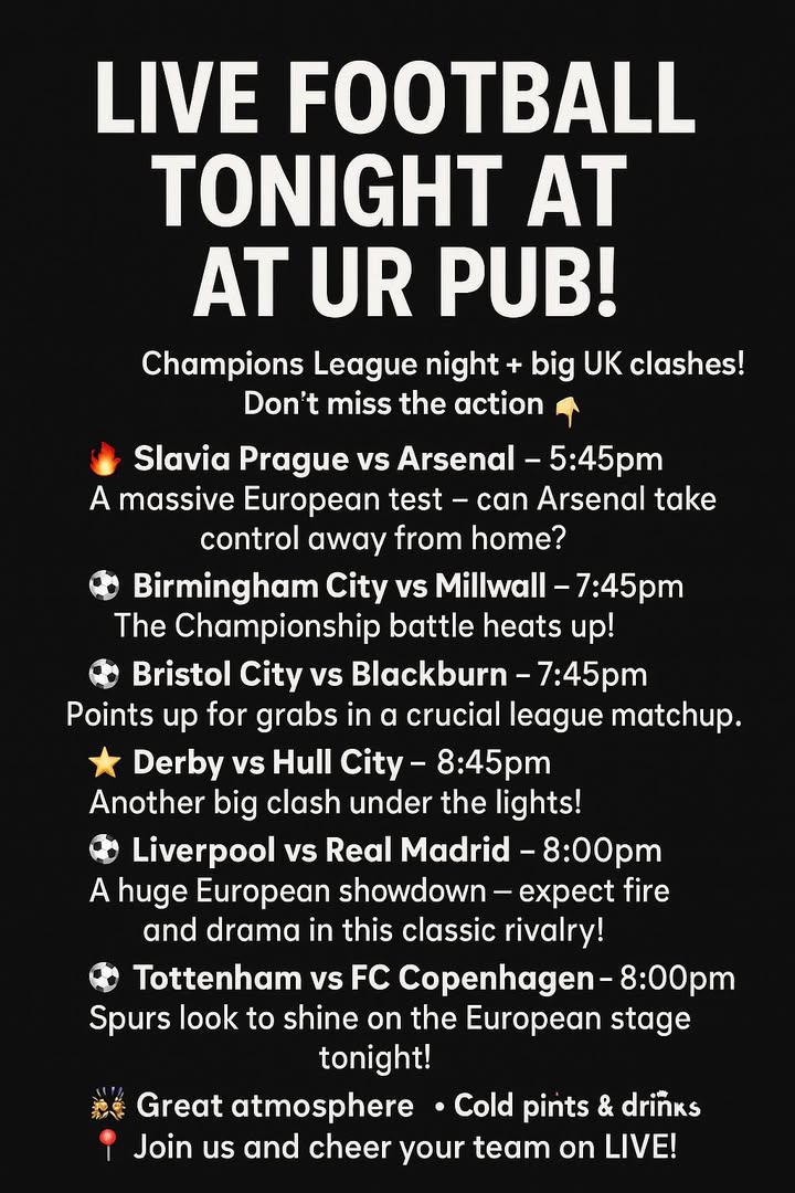 📺 LIVE FOOTBALL TONIGHT AT OUR PUB! Champions League night + big UK clashes! Don’t miss the action 👇 🔥 Slavia Prague vs Arsenal – 5:45pm A massive European test – can Arsenal take control away from home? ⚽ Birmingham City vs Millwall – 7:45pm The Championship battle heats up! ⚽ Bristol City vs Blackburn – 7:45pm Points up for grabs in a crucial league matchup. ⚽ Derby vs Hull City – 7:45pm Another big clash under the lights! ⭐ Liverpool vs Real Madrid – 8:00pm A huge European showdown – expect fire and drama in this classic rivalry! ⚽ Tottenham vs FC Copenhagen – 8:00pm Spurs look to shine on the European stage tonight! ⸻ 🎉 Great atmosphere 🍺 Cold pints & drinks 📍 Join us and cheer your team on LIVE! Who’s watching with us tonight? ⚽🙌